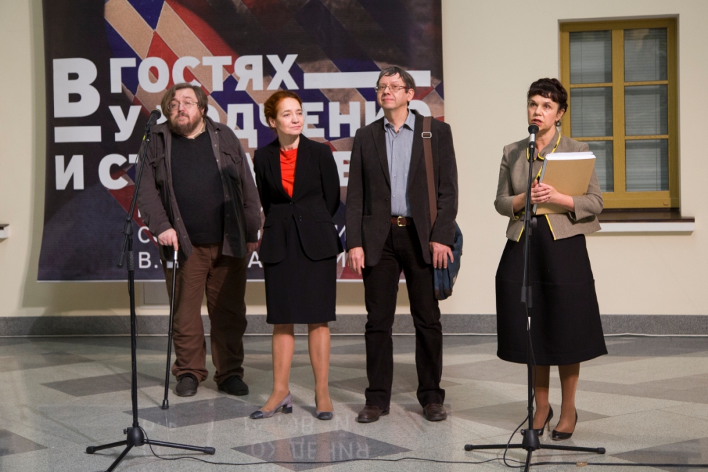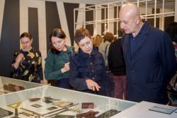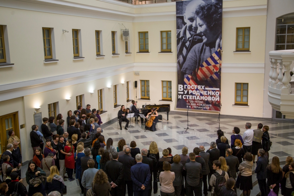 Открылась выставка "В гостях у Родченко и Степановой"26.11.2014 Отдел личных коллекций 25 ноября в Атриуме Отдела личных коллекций прошла торжественная церемония открытия выставки "В гостях у Родченко и Степановой". Церемонию провела директор музея Марина Девовна Лошак. После приветственного слова директора и небольшого музыкального номера выступили кураторы выставки: Александр Лаврентьев, Алла Луканова и Алексей Савинов. Александр Лаврентьев, внук А.Родченко и В. Степановой, сотрудник Московской художественно-промышленной академии им. С.Г. Строганова и Московской школы фотографии им. А. Родченко, даритель Отдела личных коллекций, благодаря которому в музее появилось творческое наследие А.Родченко и В. Степановой, выразил благодарность музею за столь масштабную выставку. Также благодарственные слова были сказаны заместителем заведующей Отдела личных коллекций Аллой Лукановой и найчным сотрудником отдела Алексеем Савиновым. Затем, гости были приглашены в залы выставки, расположенной на трех этажах нового здания Отдела личных коллекций.
