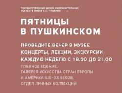 Пятницы в Пушкинском. Программа на 20 марта20.03.2015 17.30 – 19.00. Беседы о коллекционировании: «Коллекция В.А. Дудакова. Мастера "Голубой розы" и другие». Ведет Валерий Дудаков 18.00 – 19.00. Экскурсия по выставке «В гостях у Родченко и Степановой». «Традиции оп-Арта Варвары Степановой в современной моде». Ведет дизайнер, обладатель Национального приза в области Авторской моды Василий Бычков. 18:15 – 19:15. Экскурсия по выставке «Святослав Рихтер. От первого лица». Ведет куратор выставки Юлия Де-Клерк. 19:30 – 20:30. Концерт в честь дня рождения Святослава Рихтера |